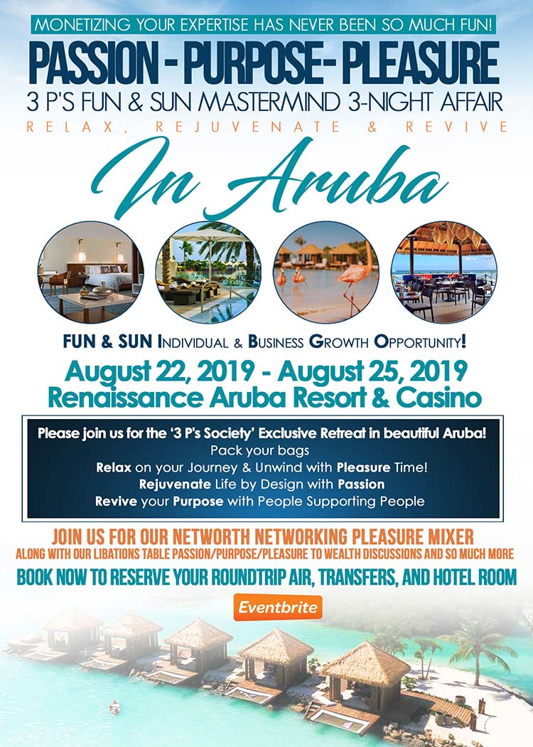 Join 3 P’s Society, for a delightful weekend in sunny Aruba for the “3 P’s Fun & Sun Mastermind Aruba”. We will gather for this 3-night affair on August 22, 2019 to August 25, 2019 at the Renaissance Aruba Resort & Casino.